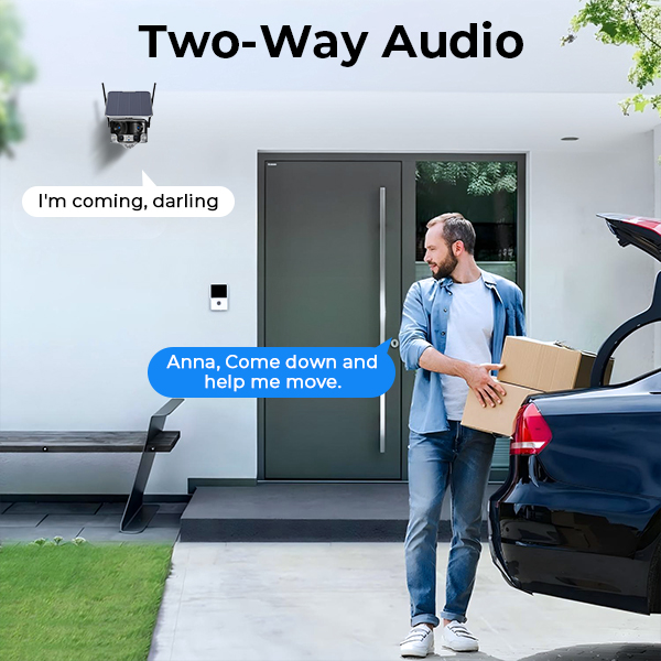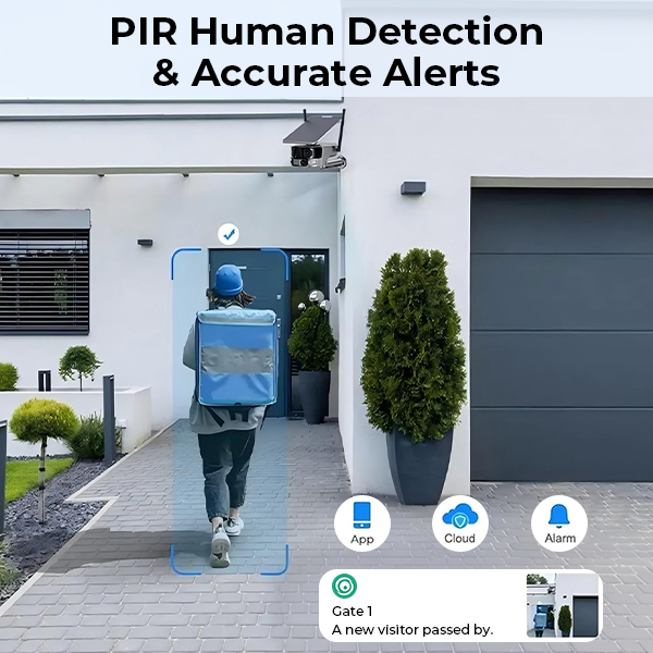 - * Smart Motion Detection & Real-Time Alerts:Esta cámara de seguridad 4G cuenta con un sensor PIR avanzado y detección de humanos por IA. Cuando detecta una amenaza real, activa automáticamente un foco brillante y una sirena potente para ahuyentar a los intrusos. Recibirás una alerta instantánea o una llamada telefónica, lo que te permitirá ver la transmisión en vivo y usar el audio bidireccional para hablar directamente con quien esté en tu propiedad.