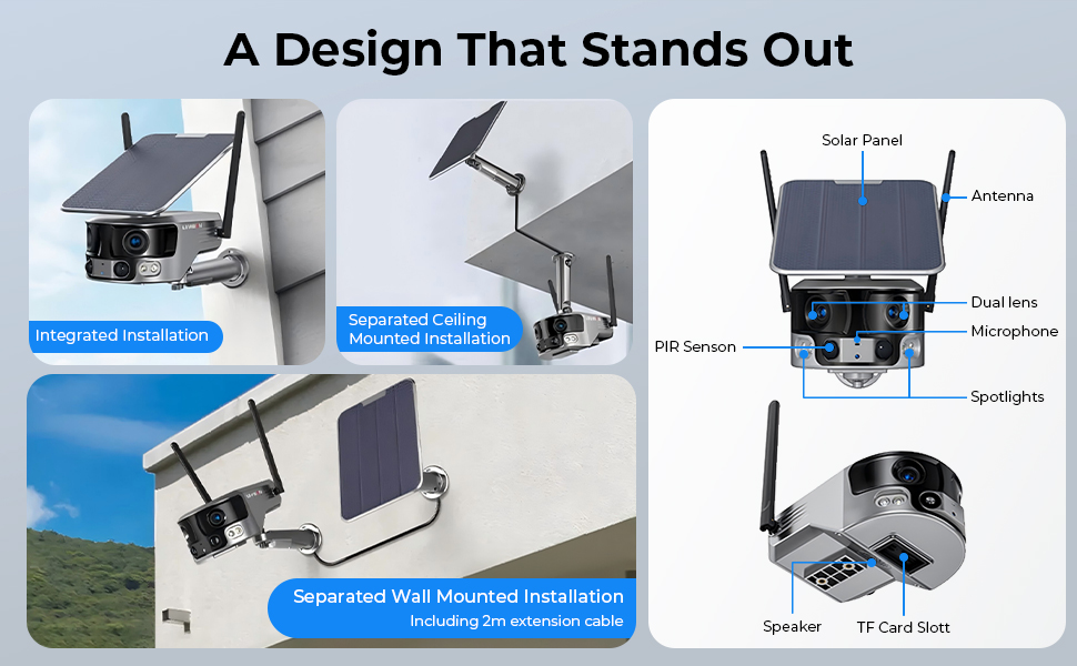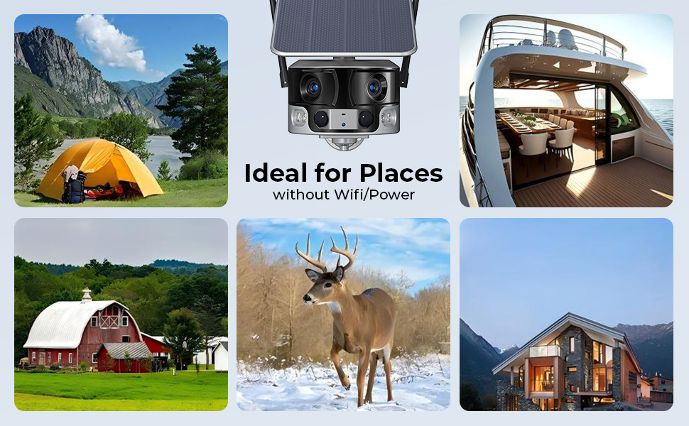 - Cobertura total, ¡libertad total! Obtén una vista panorámica de 180° en 4K cristalino de tu propiedad con nuestra cámara de seguridad celular (sin necesidad de cambiar entre diferentes lentes). Desde granjas hasta obras de construcción, obtén una seguridad incomparable, incluso donde el WiFi no llega.